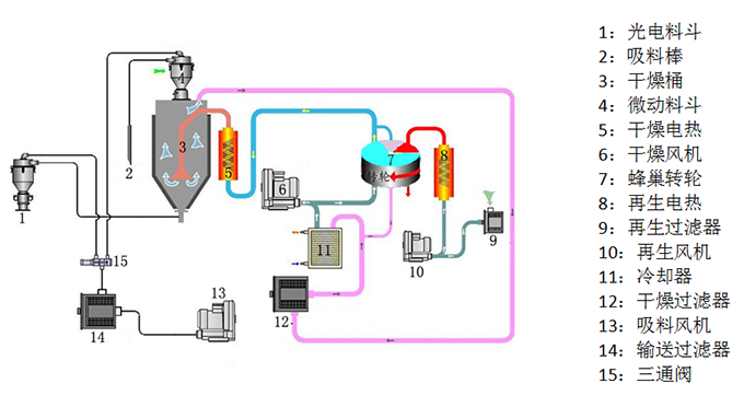 干燥除濕部分:從干燥料桶回來的濕熱空氣經(jīng)冷卻,吹入蜂巢轉(zhuǎn)輪??諝庵械乃直晦D(zhuǎn)輪吸附,然后又被再生加熱空氣所脫附。兩股氣流同時(shí)作用在轉(zhuǎn)輪上,并隨著轉(zhuǎn) 輪的轉(zhuǎn)動(dòng),使得空氣中的水分連續(xù)不斷的被吸附又被再生空氣所脫附而排出,就形成穩(wěn)定的低露點(diǎn)空氣,經(jīng)加熱到塑膠的干燥溫度,吹入干燥料桶內(nèi),形成密閉循 環(huán),干燥原料。