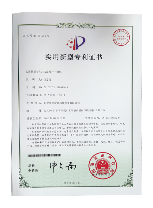 結(jié)晶攪拌干燥機(jī)專利證書