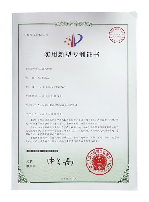 補(bǔ)風(fēng)系統(tǒng)專利證書