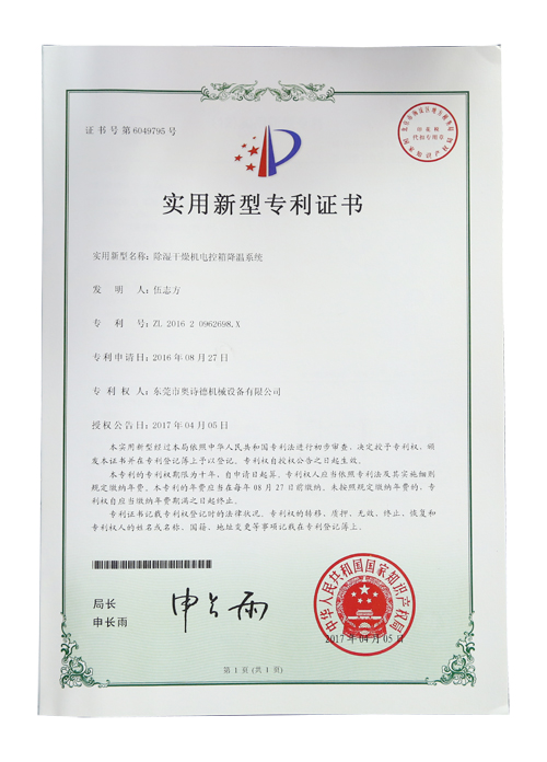 除濕干燥機(jī)電控箱降溫系統(tǒng)專利證書